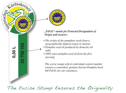 Štajerský tekvicový olej je bezkonkurenčný medzi tekvicovými olejmi, preto každý pravý štajerský tekvicový olej má svoj certifikát pôvodu a je opatrený pečaťou pravosti.