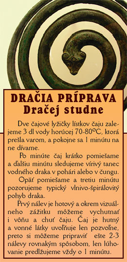 Ľudia ďakovali vodnému drakovi za svoju záchranu, omývali si tváre chladnou vodou a naberali ju do kotlíkov, aby si navarili dobrý čaj, ktorý im chutil ako nikdy predtým. Prameň nazvali Dračia studňa a neďaleko neho vystavali svätyňu a neskôr kláštor. A čaj, ktorý zberali na svahoch hôr za dedinou, pomenovali tiež Dračia studňa, aby sa ich vďaka niesla s dobrými lístkami čaju ďaleko do sveta.