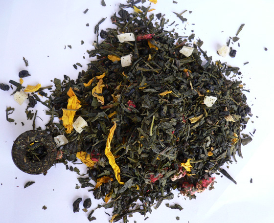 Zloženie: zelený čaj Sencha, Gunpowder, mini tuo tea, Chung Mee, Pai Mu Tan, Lung Ching, Snow buds, Pi Lo Chun, kúsky ananásu, jahodové kúsky, kvety slnečnice, aróma.