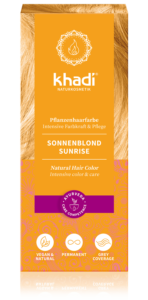 Khadi Slnečná blond pokryje aj šedivé vlasy – v žiarivom odtieni slnečnej blond. Nemá však zosvetľujúce účinky, protože je čisto rastlinná, bez peroxidu a syntetických látok. Cenné, čisto rastlinné ingrediencie dávajú vlasom intenzívne zafarbenie, žiarivý lesk a bohatú starostlivosť. Dodajú farbu, objem a lesk v jednom kroku!