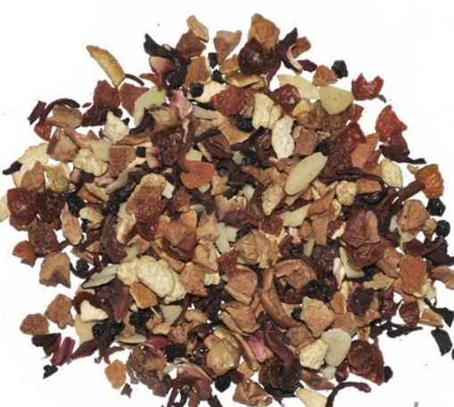 Zloženie: šípky, ibištek, jablko, kôra pomaranča, bobule bazy, Rooibos - čaj, kúsky mandlí, škorica, aróma.