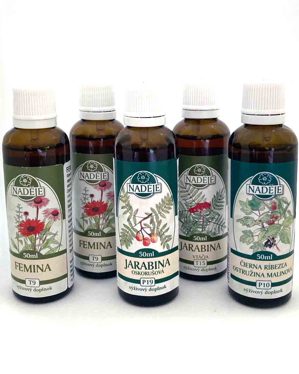 Užívanie kúry: Súčasne užívať Femina T9 + Jarabina vtáčia T15 + Jarabina oskorušová P19, po doužívaní P19 pridajte k prvým dvom tinktúram tinktúru Ríbezľa-ostružina- malina P10.