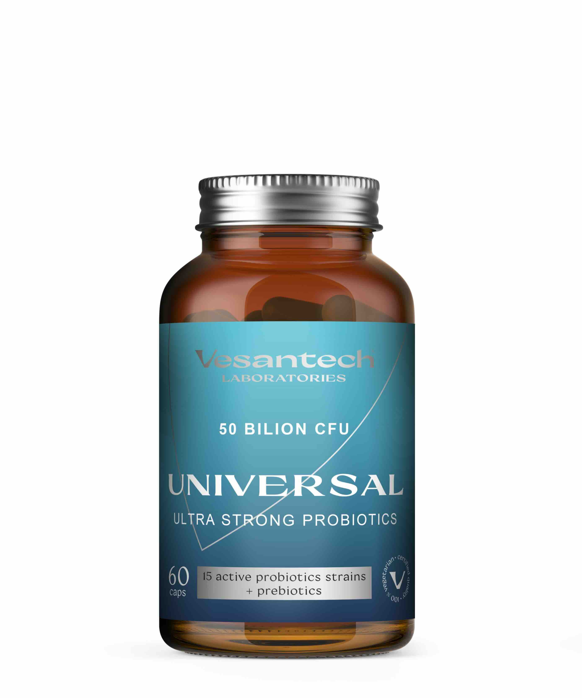 Probiotiká Vesantech Universal sú vegetariánske, bezlepkové, bezlaktózové a bez sóje.