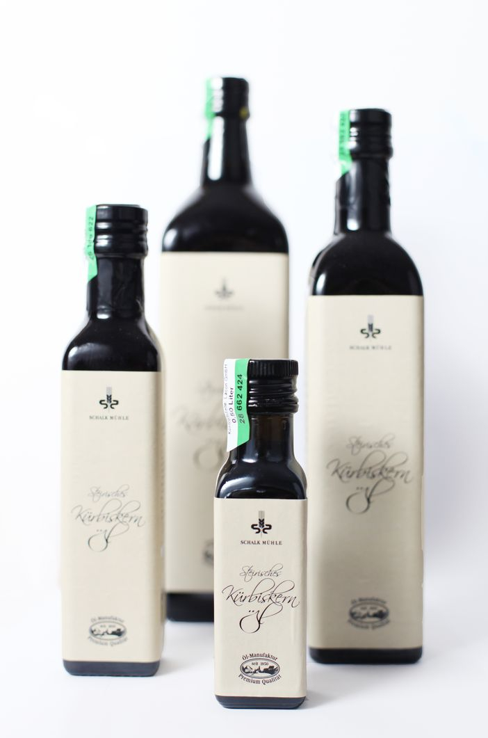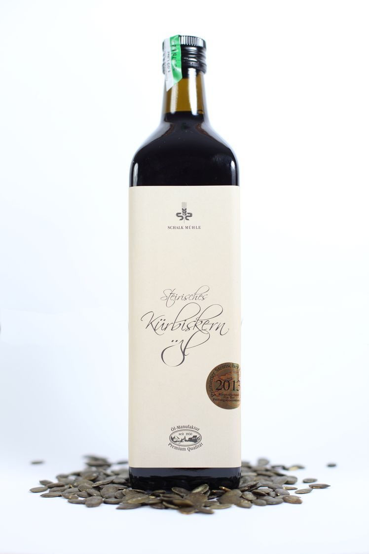 Unikátny štajerský rakúsky tekvicový olej od rodinnej firmy Schalk Muhle KG, viac krát ocenený zlatou medailou "Prémiové Štajerské tekvicové oleje" (Prämiertes Steirisches Kürbiskernöl).
